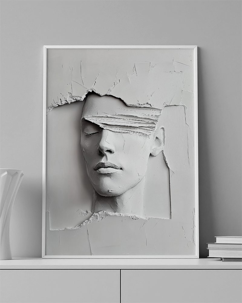 ENG: A cracked face emerging from the wall — symbolizing memories rising from the past.