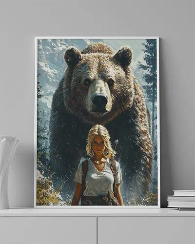 ENG: A golden-haired woman sits before a brown bear — nature whispering peace.