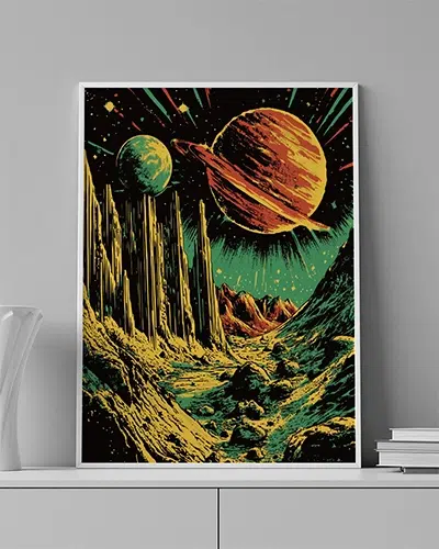 ENG: A green space storm flows between planets — dynamic and mysterious.