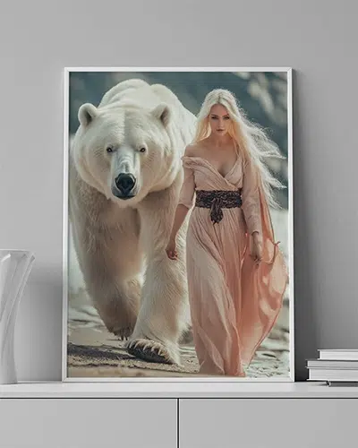 ENG: A woman in pink walks beside a mighty polar bear — the princess of the north.