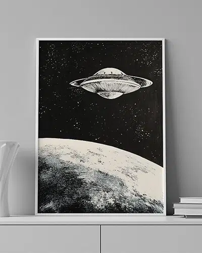 ENG: A UFO hovers over the calm surface of the moon.