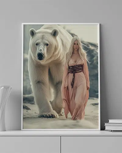 ENG: A dreamlike vision — a woman walks fearlessly into the unknown with her white bear.