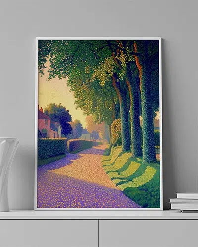 ENG: A tree-lined path bathed in orange sunset — evening whispers a gentle goodbye.