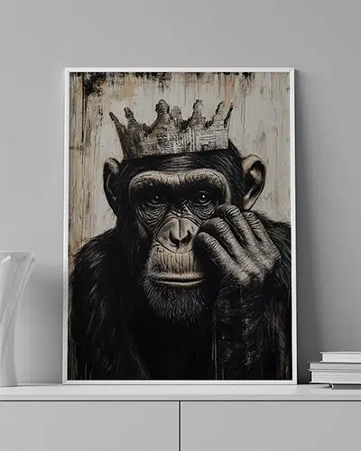 ENG: A monkey in dim light wearing a dark crown — the king who hides his power behind silence.