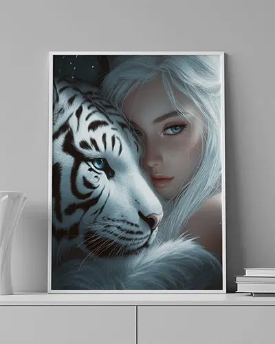 ENG: A white-haired woman rests her cheek on a white tiger — a timeless moment of affection.