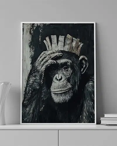 ENG:A monkey smiles humbly beneath a wooden crown, symbolizing wisdom in calm leadership.