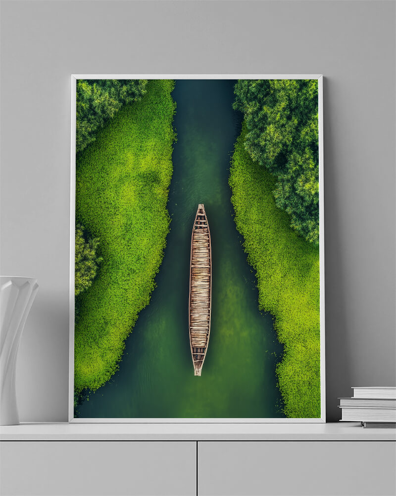 ENG: A lone boat gliding through a calm green river — whispering peace and serenity.