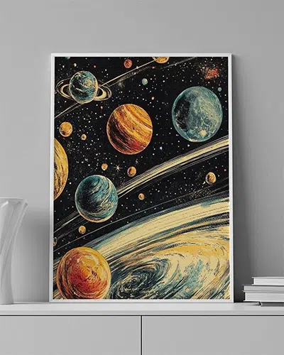 ENG: A cosmic scene full of vibrant planets in a celestial dance