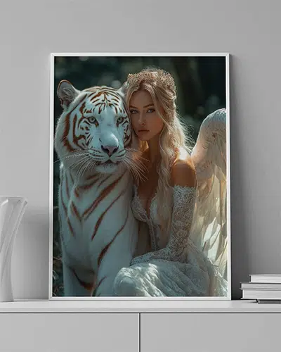 ENG: A woman embraces a white tiger — two beings from a world of light and beauty.